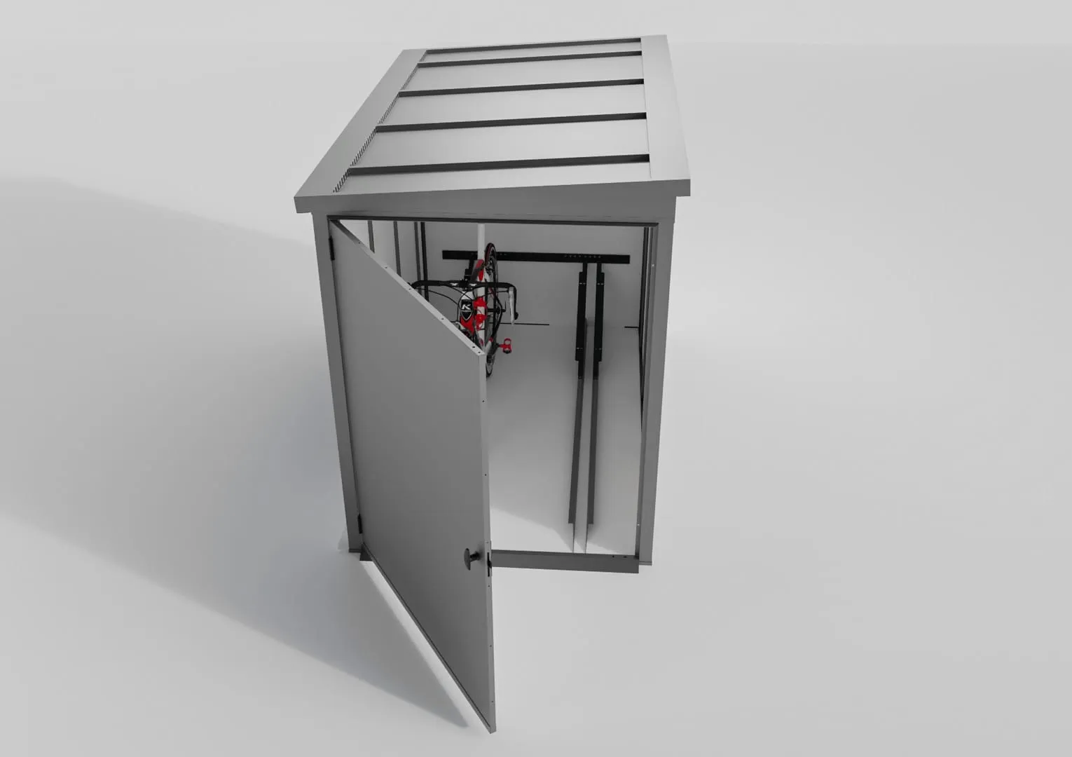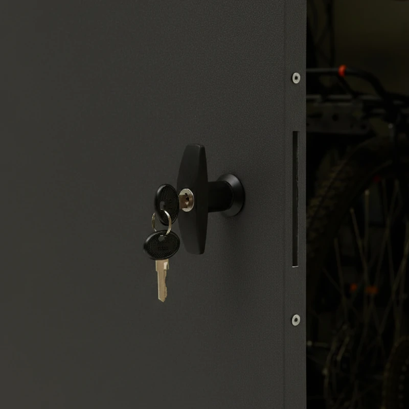Die Innenmaße von 119 x 209 cm bieten ausreichend Platz für zwei große Fahrräder. Dank der verstellbaren Führungsschienen lassen sich auch schwere E-Bikes oder Räder mit breiten Reifen (MTB) mühelos und sicher positionieren. Die Tür kann wahlweise mit Rechts- oder Linksanschlag montiert werden, was Ihnen maximale Freiheit bei der Standortwahl lässt.