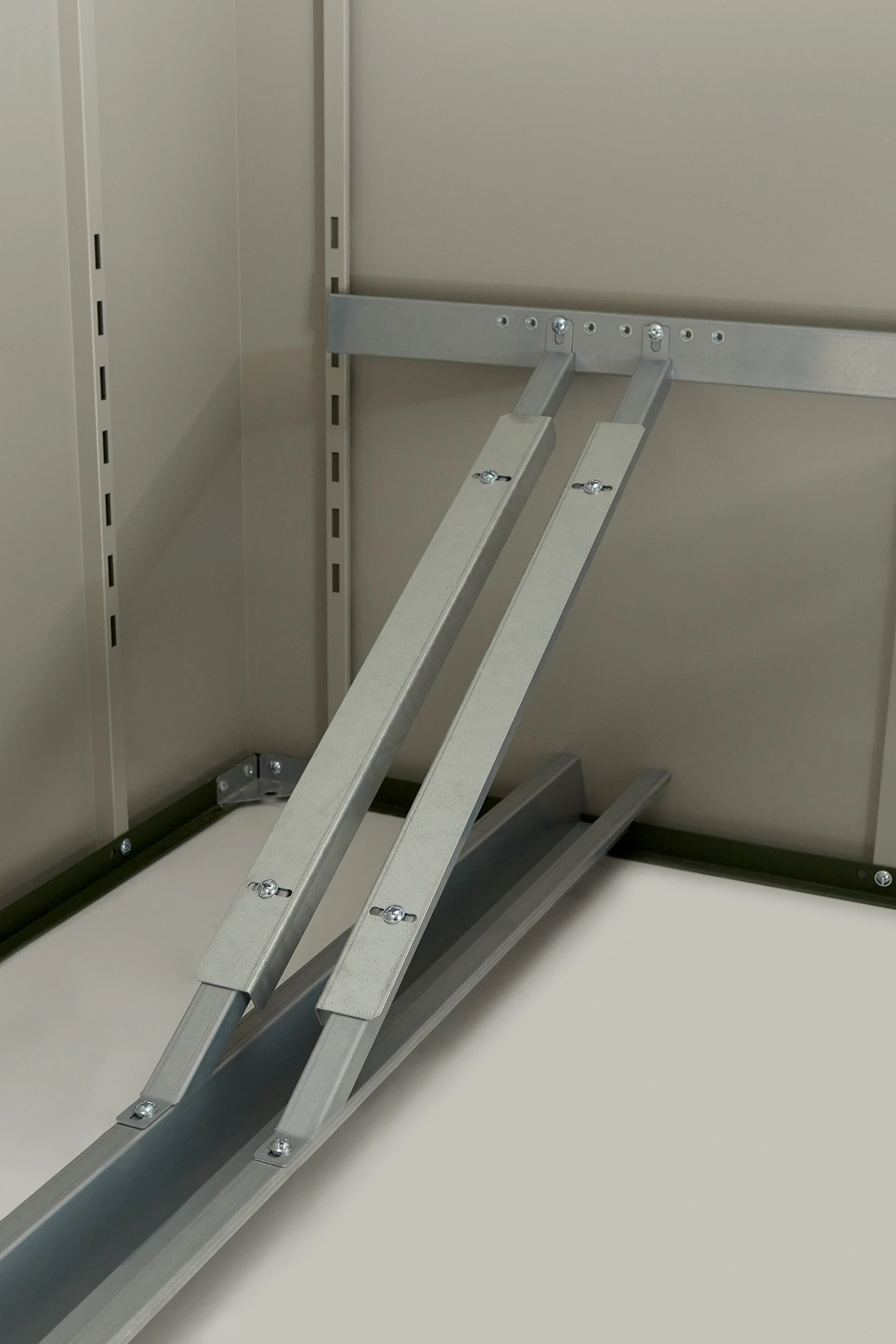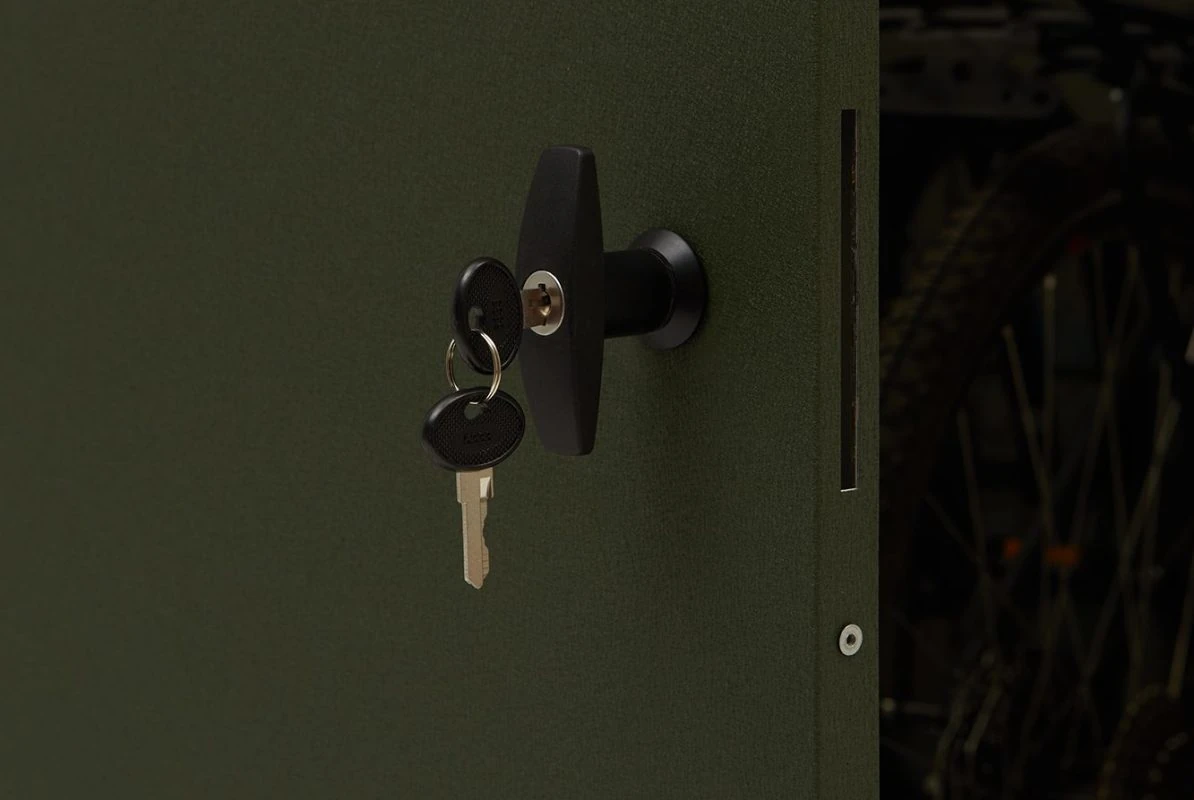 Der hochwertige Dreipunktverschluss bietet optimalen Schutz gegen unbefugtes Öffnen. Er sichert die Tür an mehreren Punkten und erhöht so die Sicherheit Ihrer Fahrräder deutlich.