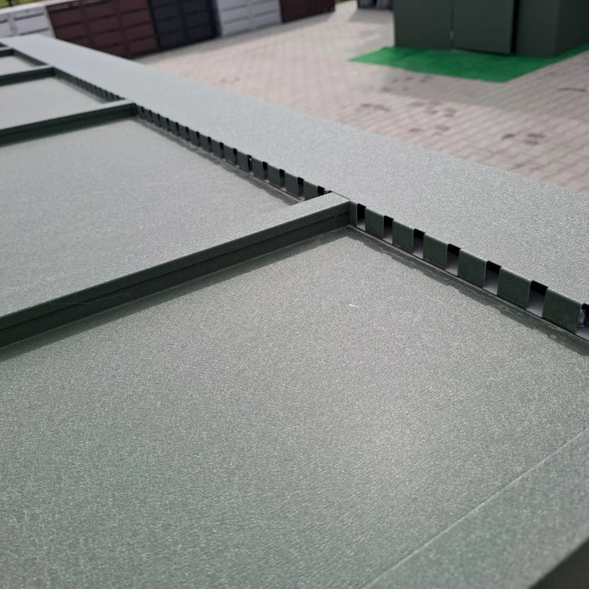 Regelmäßige Pflege verlängert die Lebensdauer: Entfernen Sie Schmutz und Laub, reinigen Sie die Oberfläche gelegentlich mit mildem Wasser und vermeiden Sie aggressive Reinigungsmittel. Die Pulverbeschichtung schützt die Garage langfristig vor Korrosion.