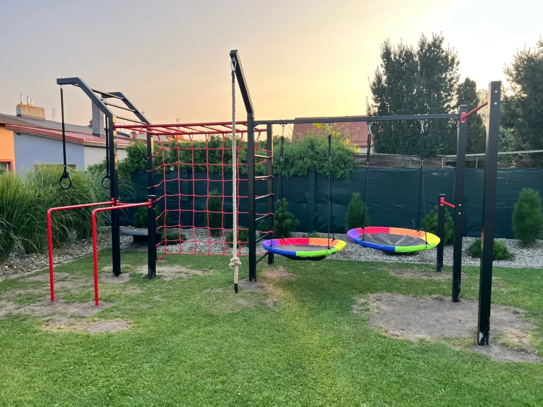 Kletternetz, Nestschaukel sowie ein Seil mit kugelgelagerten Griffen.