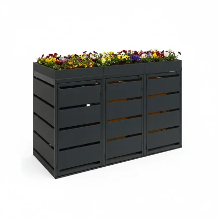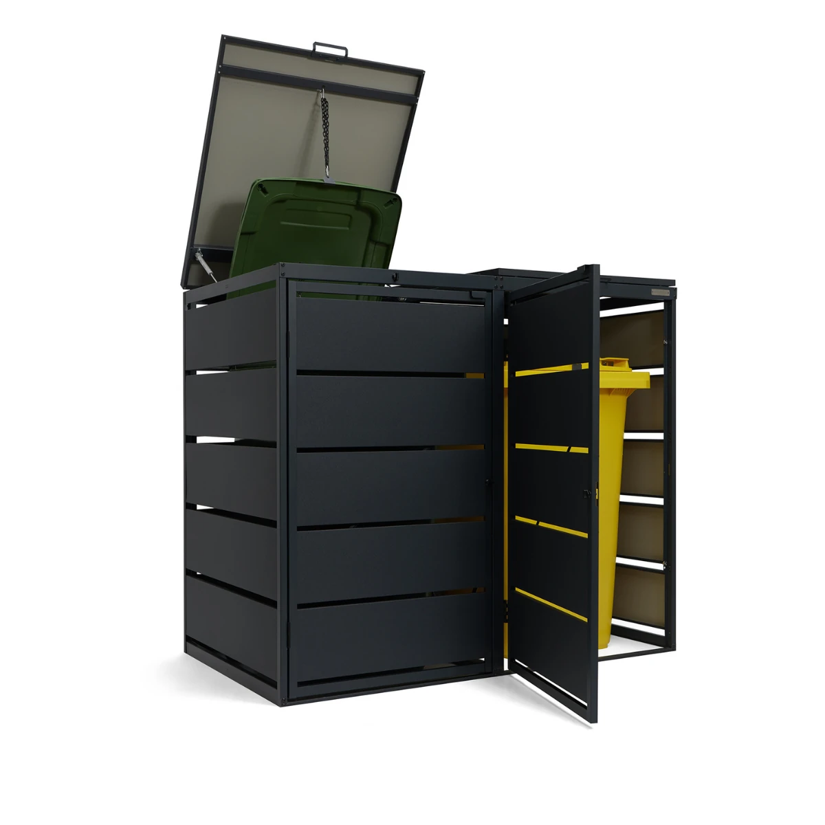 Die QBOX Mülltonnenbox für zwei 240-Liter-Mülltonnen kombiniert Schutz und Ordnung. Hochwertige Materialien und pulverbeschichtetes Stahlblech sorgen für Langlebigkeit und Witterungsbeständigkeit.