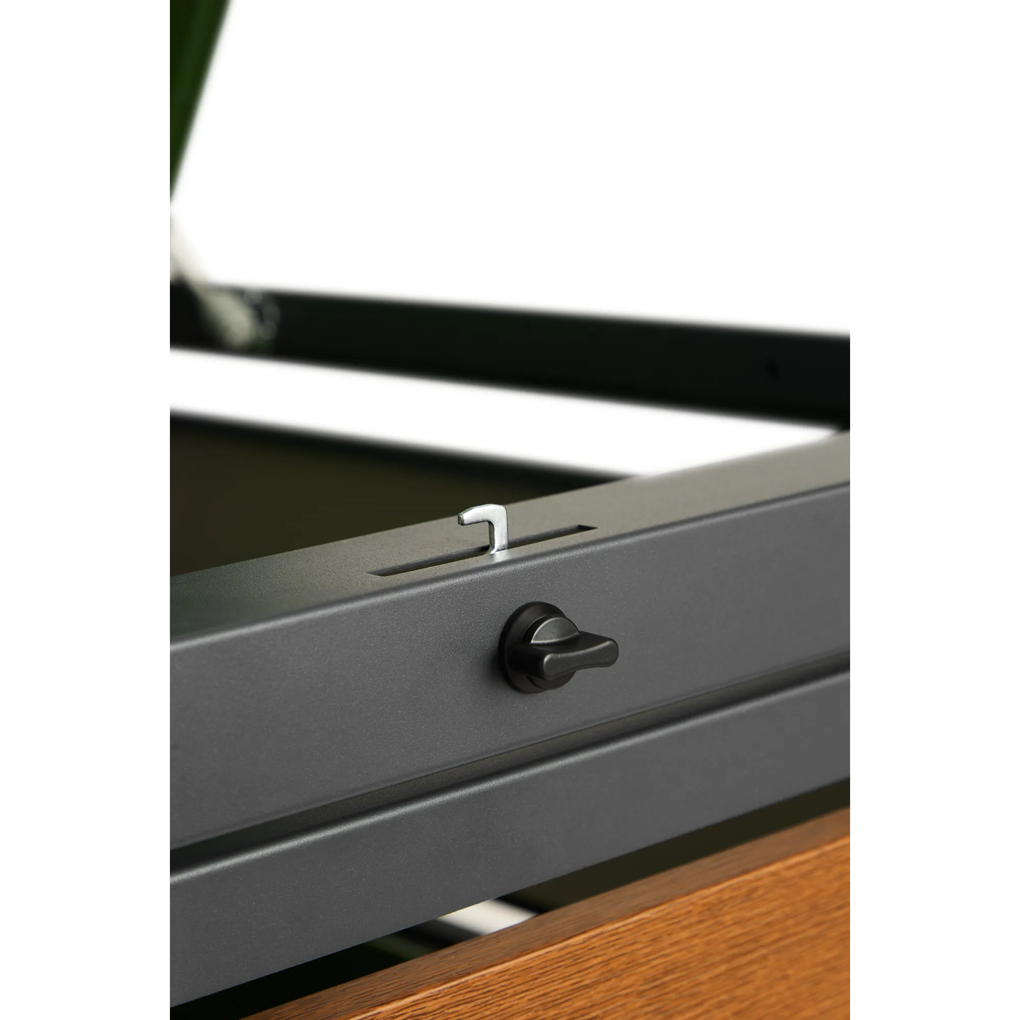 Sowohl die Klappe als auch die Tür sind mit einem stabilen Drehschloss ausgestattet. Diese Lösung sorgt für einen festen Verschluss und gewährleistet, dass alles sicher an seinem Platz bleibt – für mehr Komfort und Ordnung im täglichen Gebrauch.