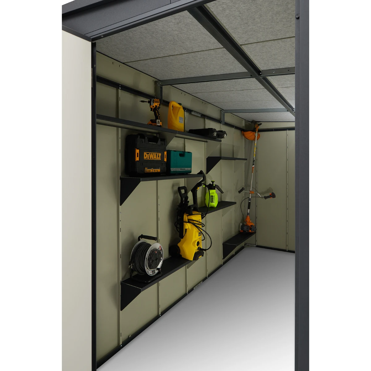 • Edles Finish: Die Pulverbeschichtung schützt das Metall zusätzlich vor Witterungseinflüssen und verleiht dem Innenraum Ihres Schuppens eine professionelle Optik.